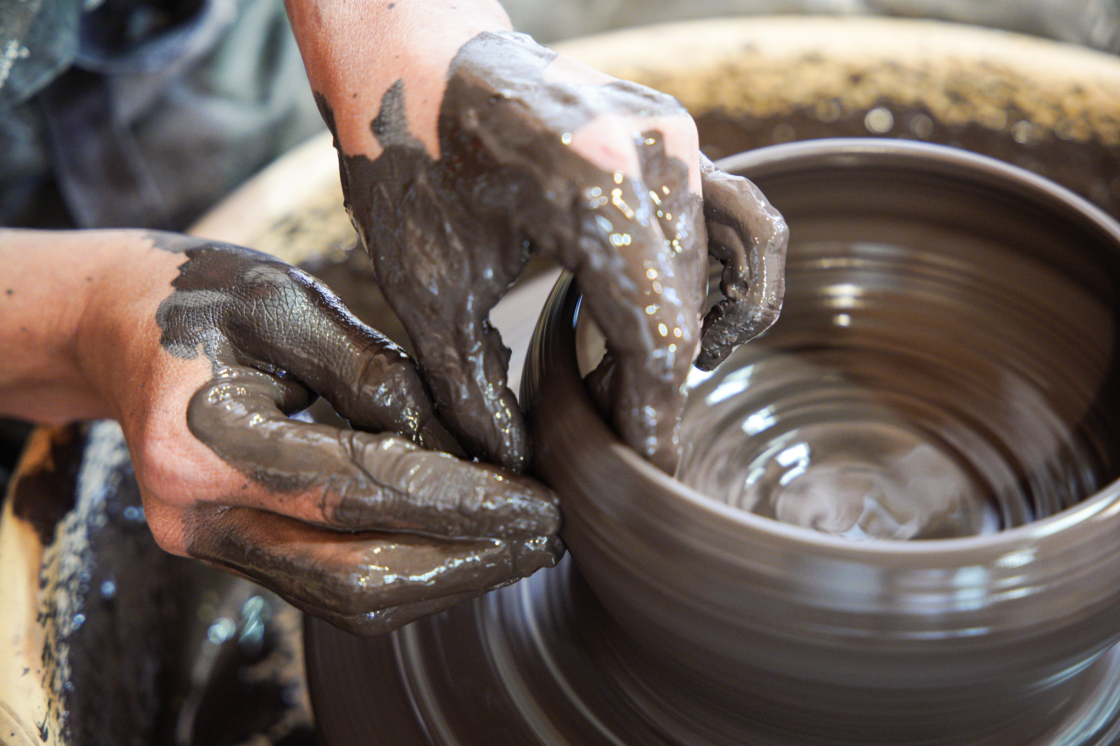 Une fois la terre souple et vos mains échauffées, vous vous installerez sur le tour. Vous monterez une quille pour éliminer les éventuelles dernières bulles d'air, et centrer la terre sur le tour grâce à la force de vos mains ! Toujours accompagné.e, vous verrez peu à peu l'argile prendre forme sous vos doigts, jusqu'à ce qu'elle devienne un bol (ou une autre petite pièce), que vous pourrez sortir du tour.